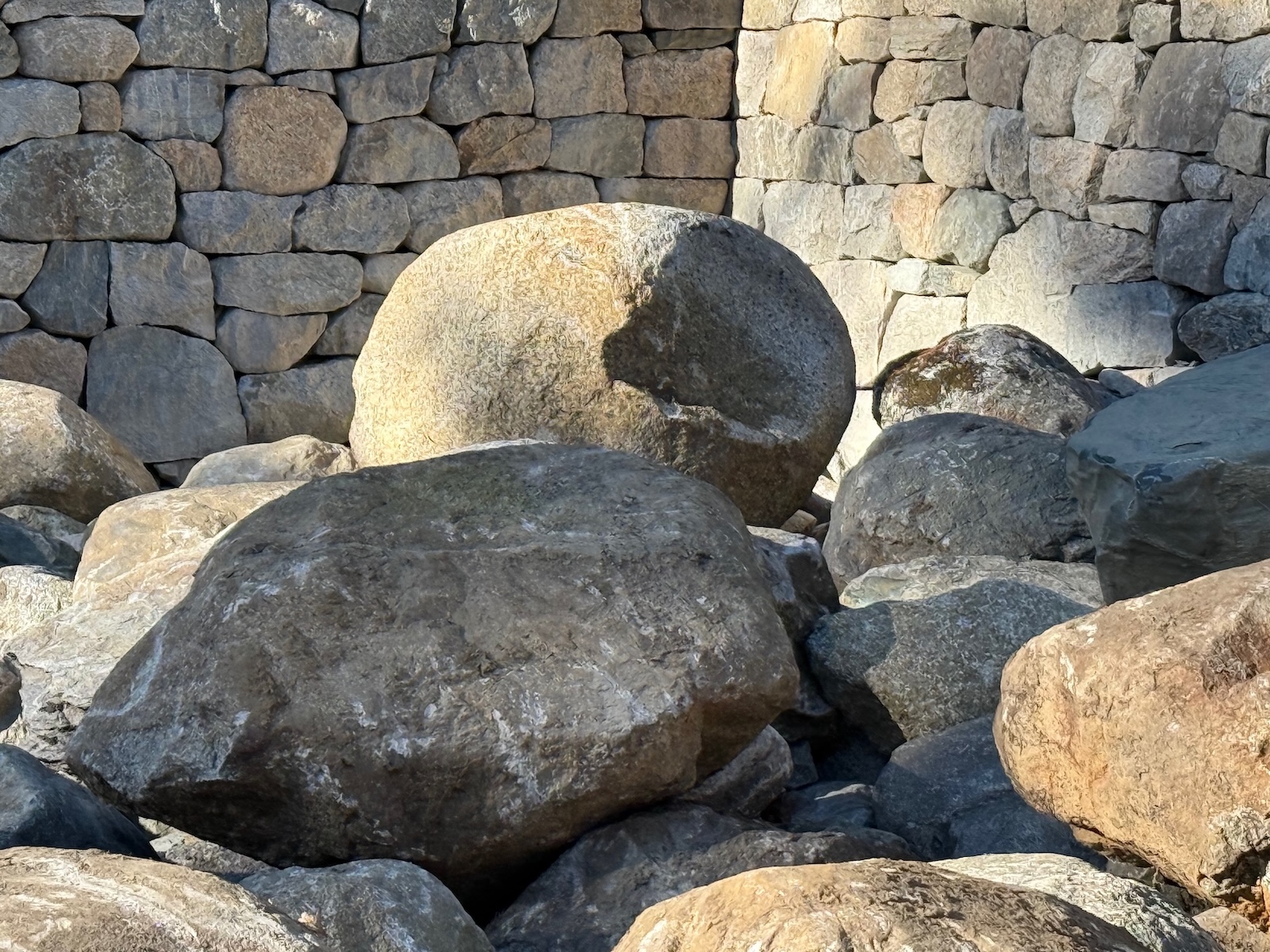 In 2025, stones that have been unearthed over time through working the land have been gathered to make a field of stones. The ‘field’ is contained within a four-sided walled enclosure that can be entered through a small gate for those who feel able to walk over the rough stones. There is nothing inside the enclosure but stone. It is the opposite to what normally occurs when land is cleared – a reminder of what is taken out of a place to make a field.